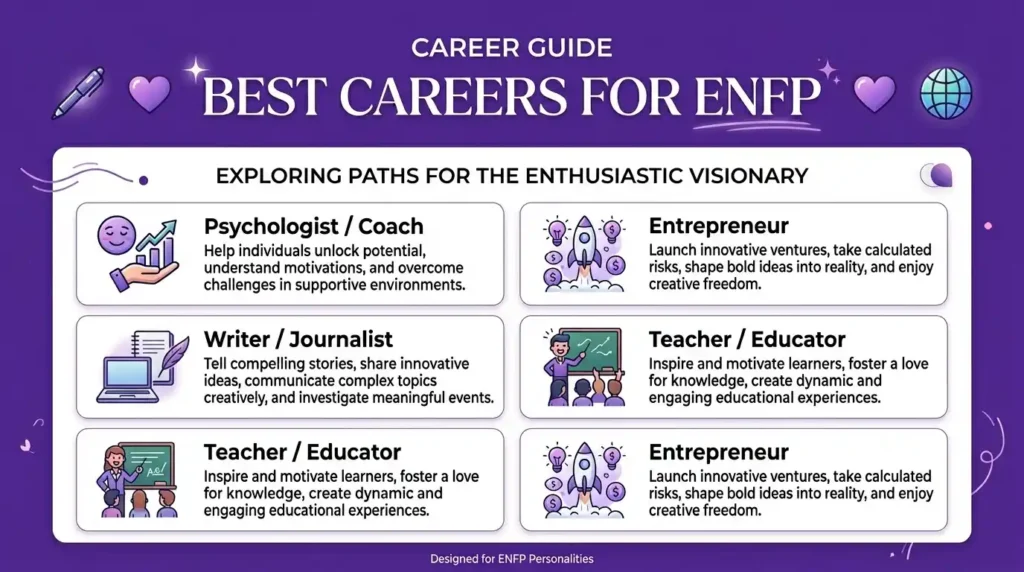 ENFPs thrive in careers that allow creativity, freedom, and meaningful interaction with others. They prefer work environments that are flexible, dynamic, and people-focused, where they can explore new ideas and make a real impact.
